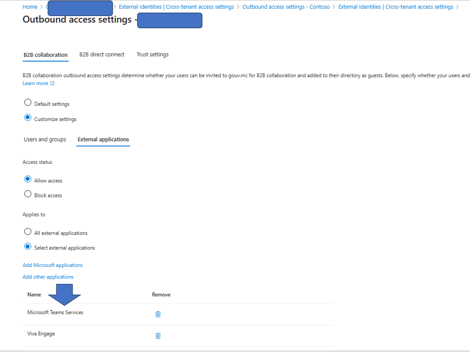 Aprés avoir vérifier la configuration entre les deux tenants, je me suis apercu que dans la configuration du Tenant depuis lequel l’utilisateur essyait de se connecter (tenant source) , la partie OutBound | application ne comprenait pas l’application Microsoft Teams Service . je l’ai ajouter et cela a en partie resolu le probléme