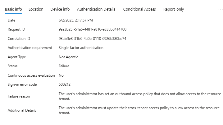 The ressource tenant’s cross-tenant access policy does not allow this user to access this tenant