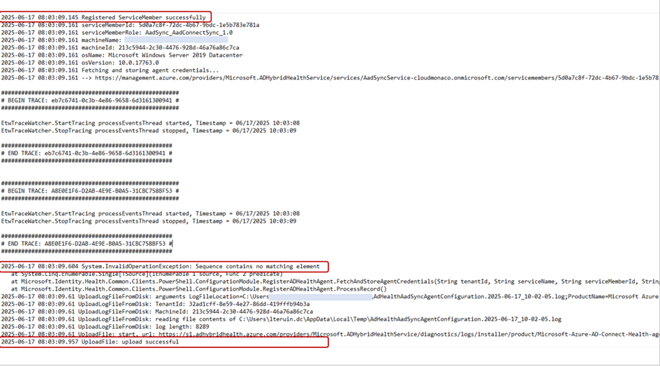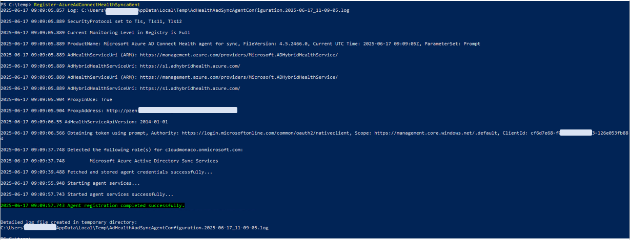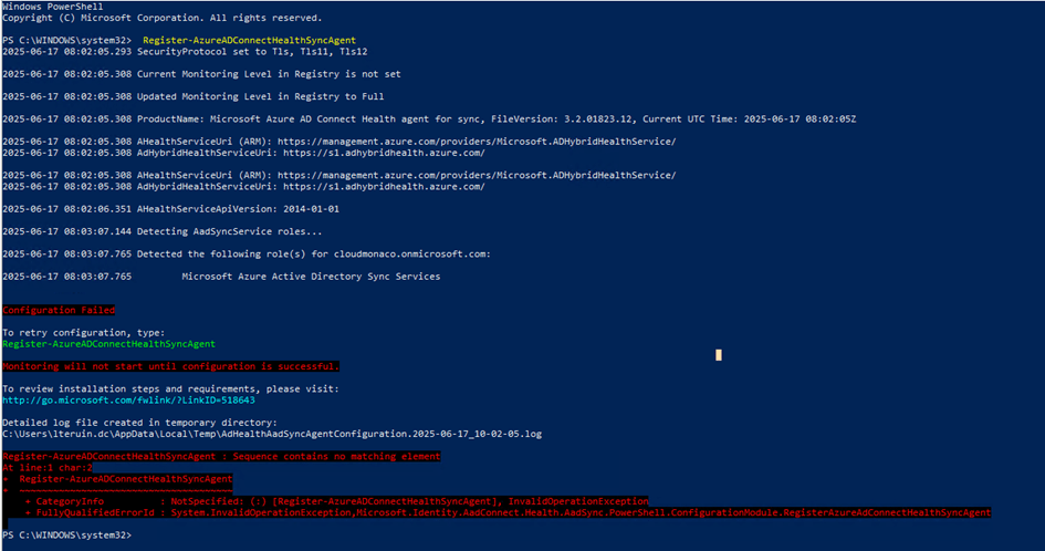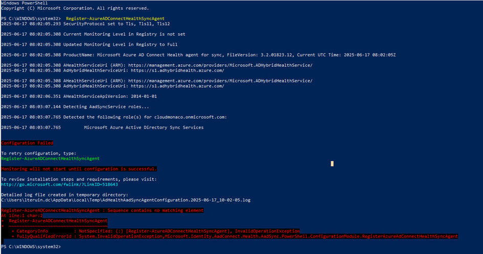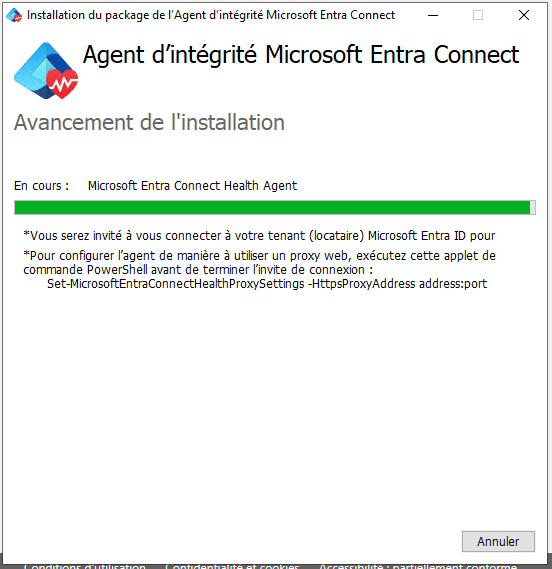 Nous nous sommes aperçu qu’une ancienne valeur de serveur proxy était toujours en place grâce au script Powershell fourni par les équipes supports (AADCHRep.ps1).Nous avons pu le modifier et relancer l’enregistrement du service via la commande : Register-AzureADConnectHealthSyncAgent.
