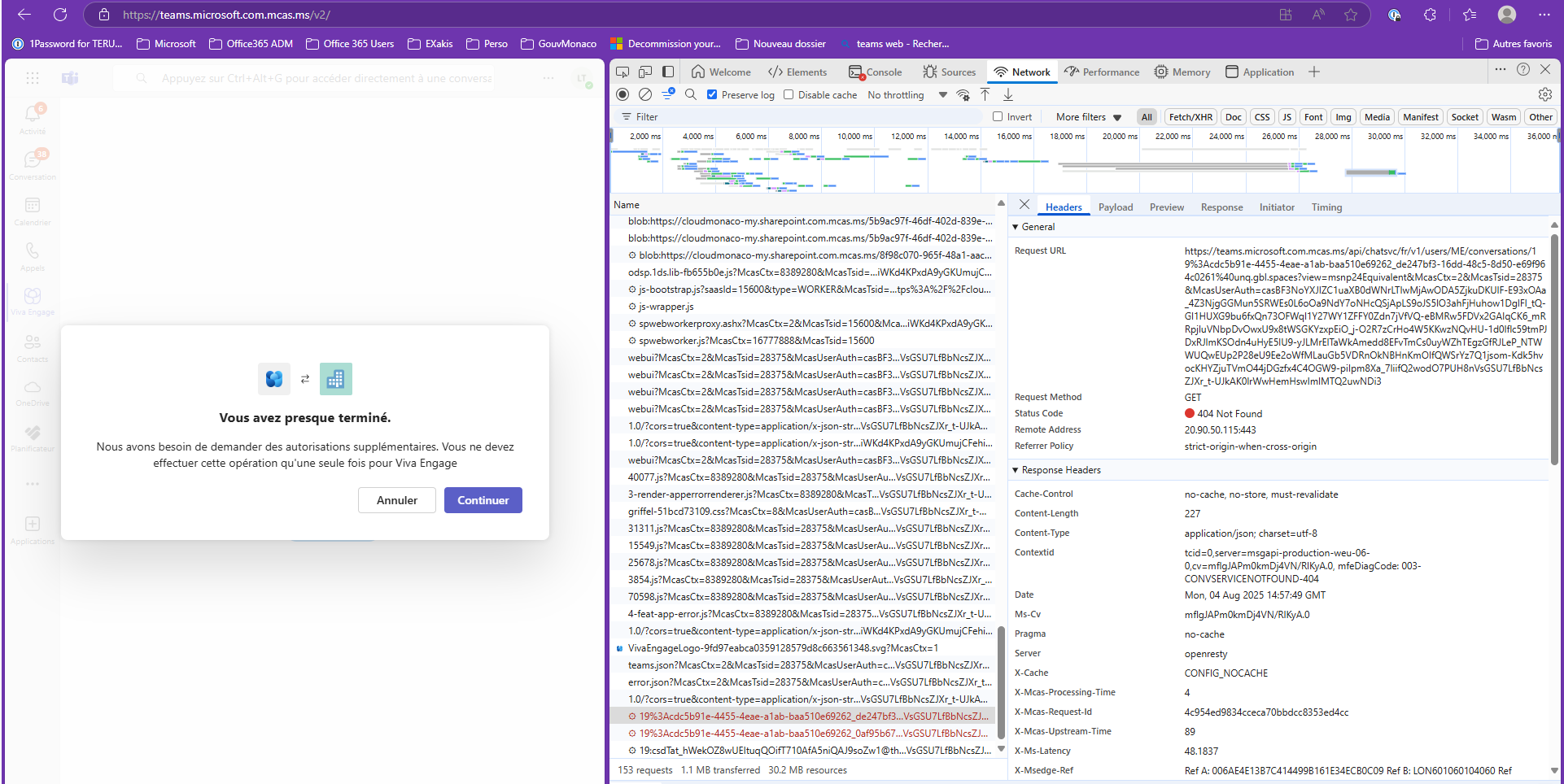 Nous avons réactiver la regle d’accés conditionnels pour voir si c’est celle ci qui pose probléme. aprés la réactivation, nous nous sommes deconnecté et reconnecté avec le client Teams Web avec Edge et ce dernier ne se connecte plus a l’application Viva Engage.