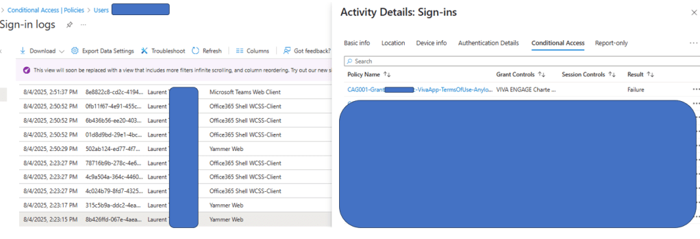Il est a noter que nous avons dans notre configuration deux conditions d’utilisation une pour l’application Teams et une pour l’application Viva Engage. Cela semble fonctionné convenablement avec les deux régles d’accés activées, si l’on utilise les deux clients séparément mais cela ne semble pas fonctionner avec le client Teams Desktop si l’on tente d’accéder à Viva depuis le client Teams Web.