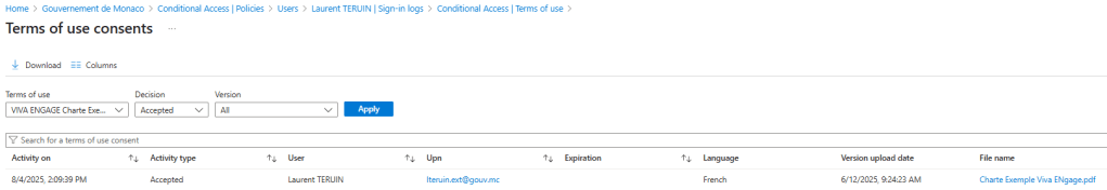 En effet, nous avons créé une règle d’accès conditionnelle qui impose à chaque utilisateur de signer une charte d’usage avant de pouvoir accéder à l’application Viva.