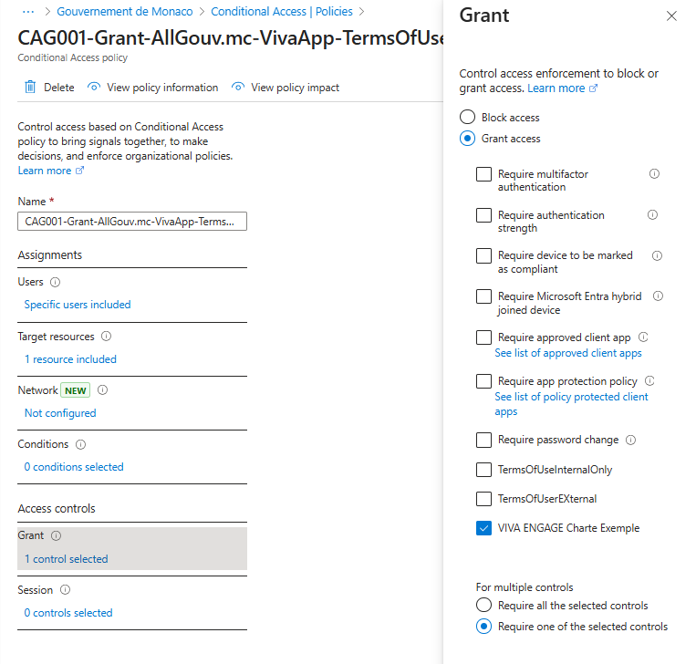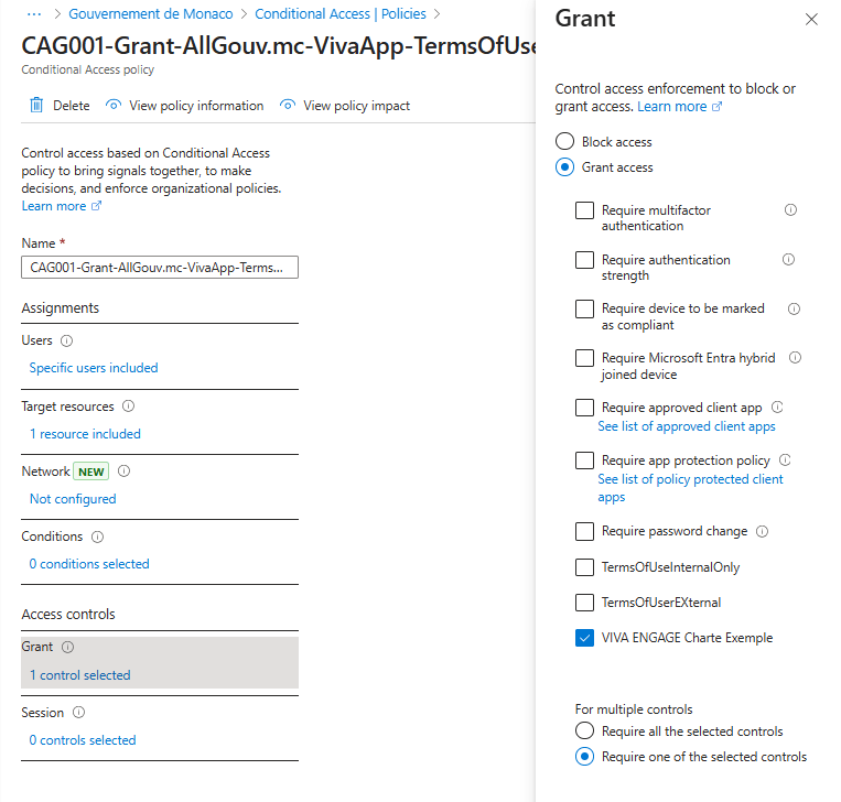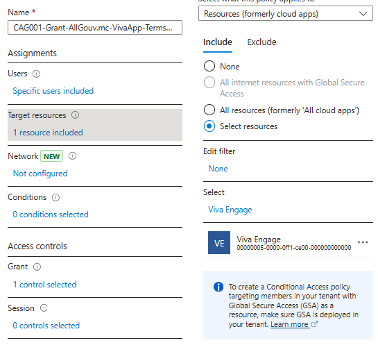 La solution est d’utiliser pour les conditions d’utilisations la fonctionnalité directement disponible dans Viva Engage plutot que les régles d’accés conditionnelles / The solution is to use the functionality directly available in Viva Engage for the conditions of use rather than conditional access rules.