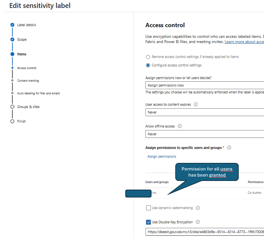 To date, we have completed the implementation of the DKE solution with Purview and we have configured the data labels so that they use the URL in question of the key, as you can see in the following screenshot.