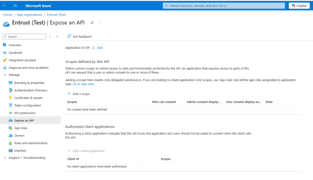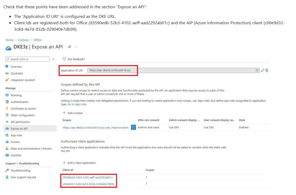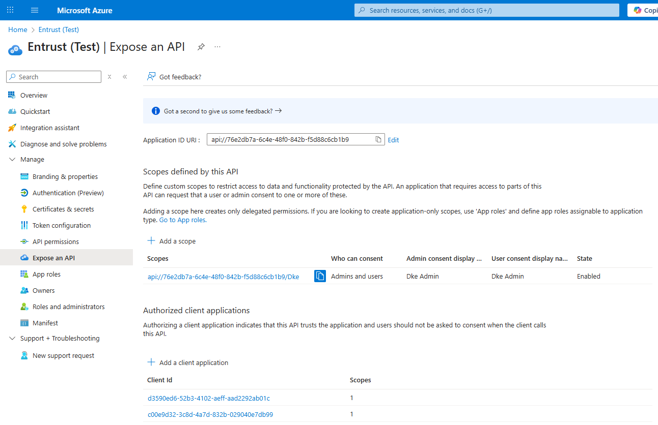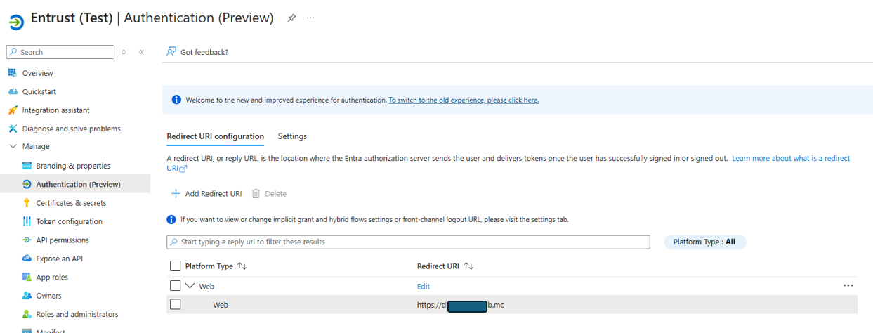 In the «Authentication» section of the DKE web application registration, verify that the redirect URI does not contain a trailing slash