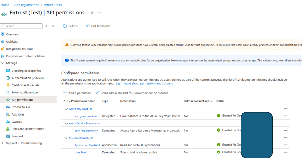 In the section “API permissions”, make sure the whole tenant has been granted consent to “User.Read”: