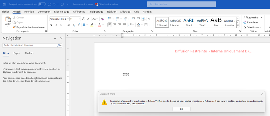 When we use this label with DKE encryption, it is not possible to save this document, as shown in the following figure