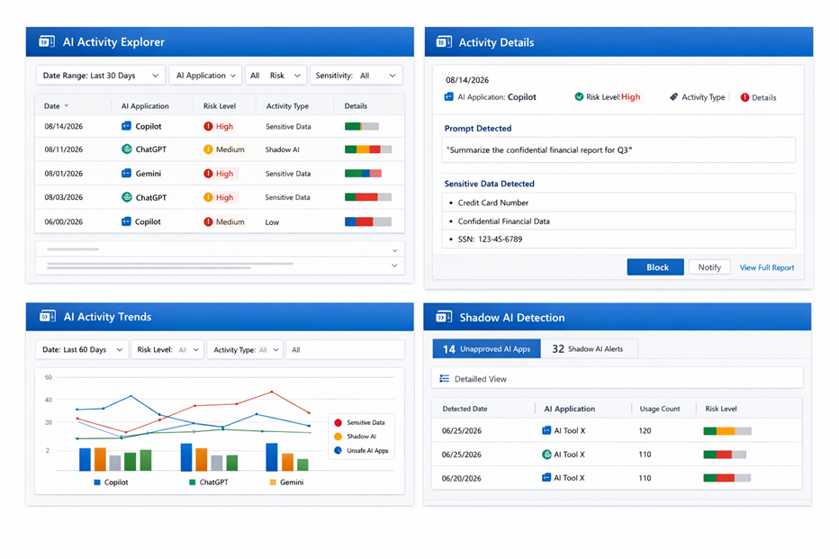 DSPM‑AI permet une supervision complète étendue à Microsoft Copilot, aux applications IA internes, aux modèles tiers et aux agents IA. Il peut également identifier des cas de shadow AI, ce qui réduit le risque d’introduire des applications non contrôlées au sein du système d’information.