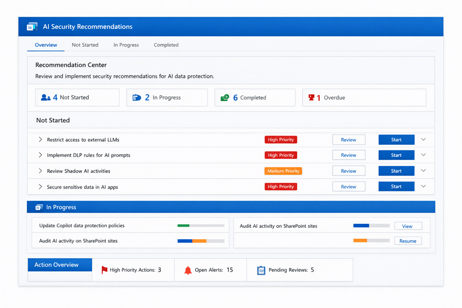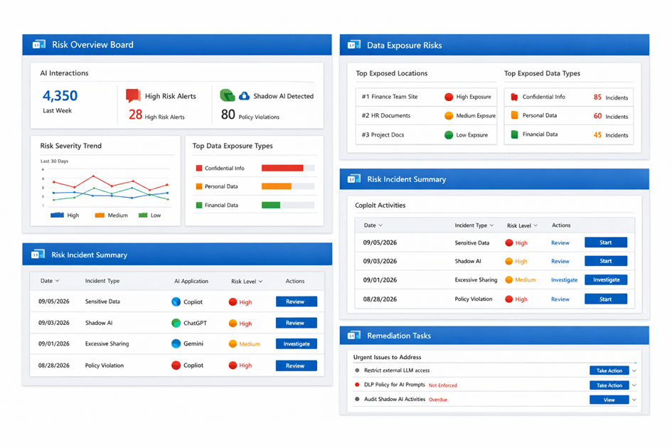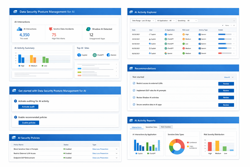 Un tableau de bord complet fournit des informations en temps réel : tendances d’usage, interactions IA à risque, scoring des menaces, recommandations de remédiation et intégration avec Security Copilot. Cela permet aux équipes sécurité d’intervenir rapidement et efficacement en cas d’incident IA.