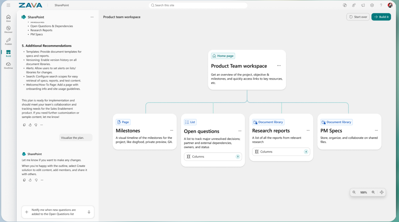 L’ancien concept de “Knowledge Agent” évolue et devient “AI in SharePoint”. Cette capacité permet de concevoir et structurer des sites, bibliothèques ou listes SharePoint simplement en langage naturel, sans expertise technique avancée. L’IA se charge également d’extraire automatiquement les métadonnées et d’adapter les bibliothèques à l’évolution des contenus. La fonctionnalité est proposée en aperçu public en mars, avec un déploiement mondial progressif à partir de mai.