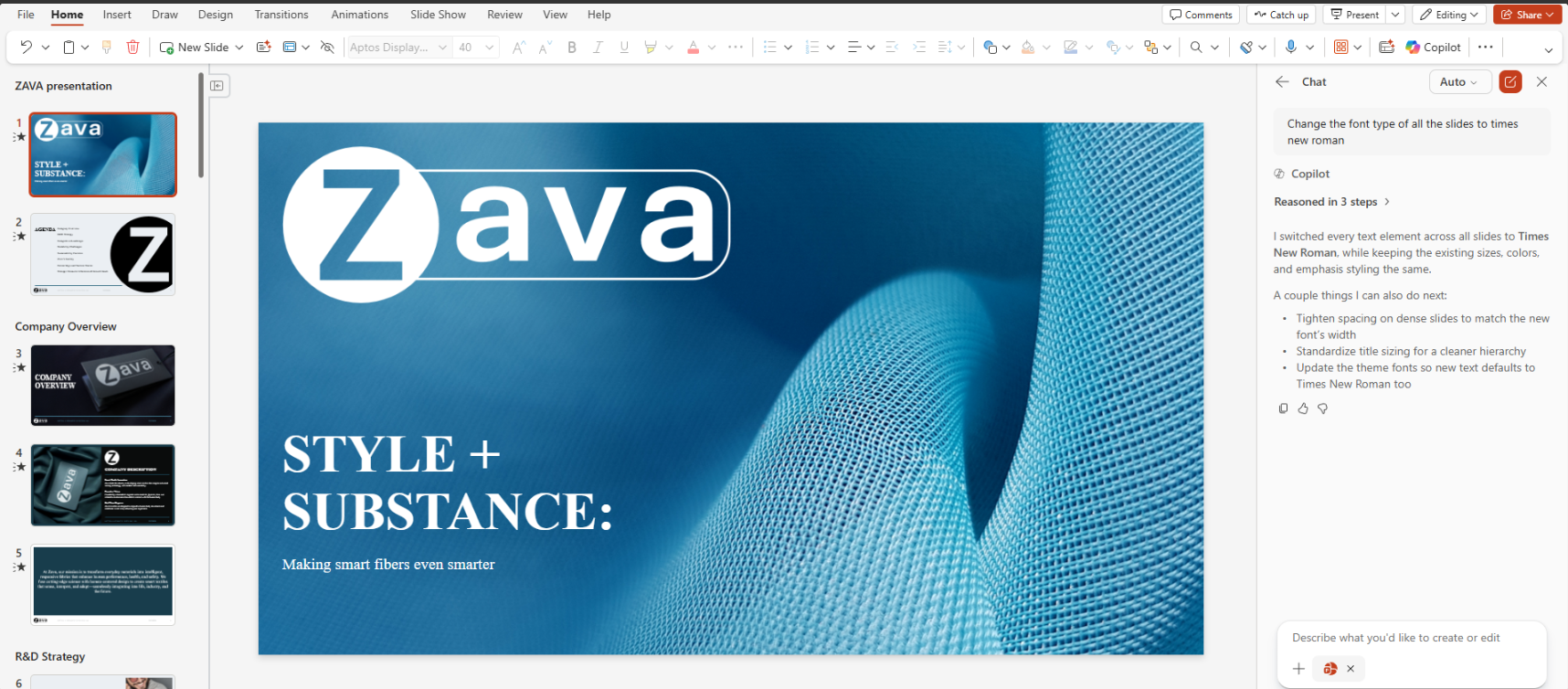 Copilot peut standardiser en une seule action les polices, tailles de texte et styles de puces d’une présentation entière. Cette fonctionnalité simplifie considérablement la mise en forme et garantit une cohérence visuelle professionnelle sur l’ensemble des diapositives.